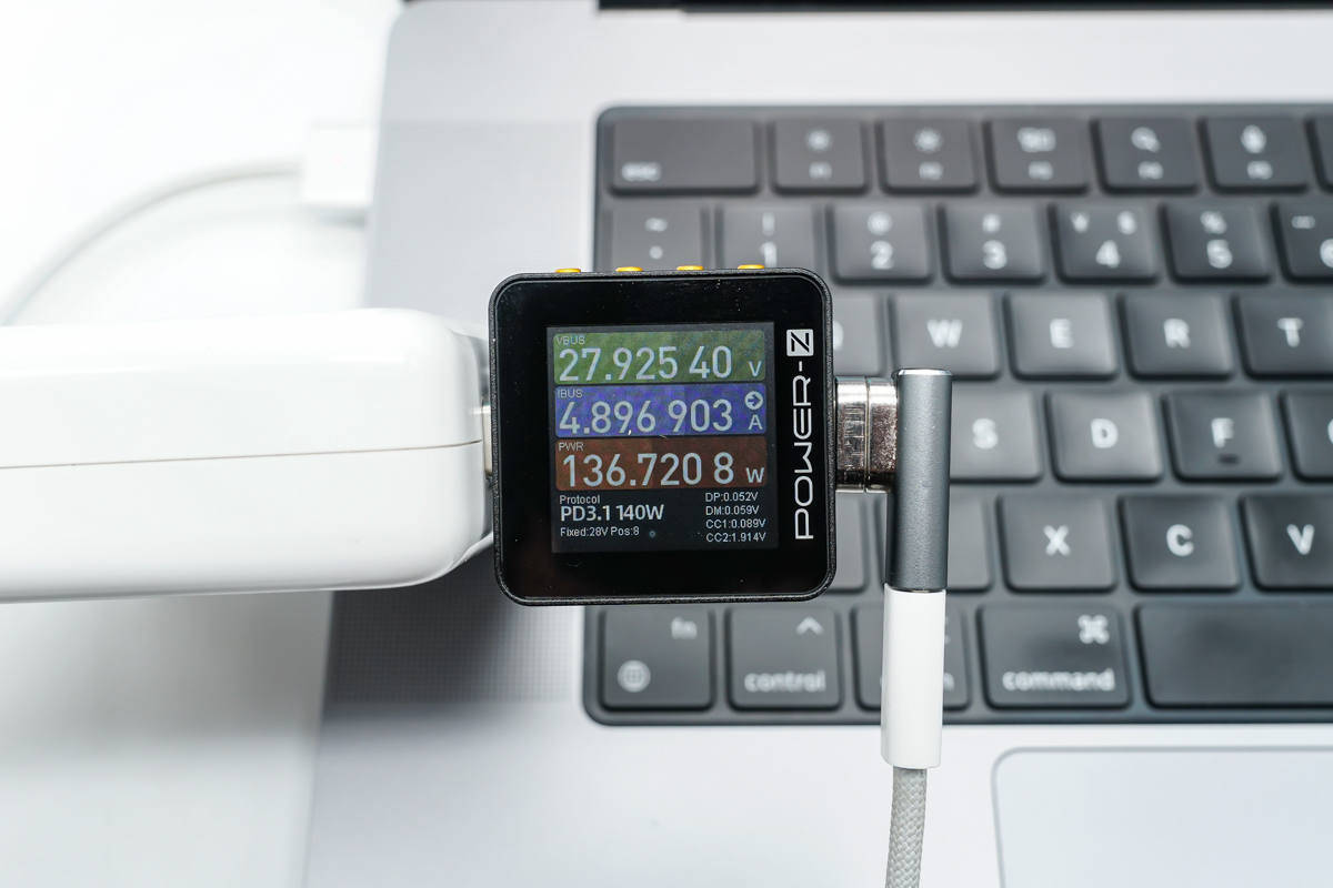 Pat... tas atbalsta arī 140 W ātro uzlādi, un adapteris ir savienots ar Apple 140 W gallija nitrīda lādētāju un MagSafe 3 ātrās uzlādes kabeli. Šobrīd uzlādes spriegums ir 28 V, un jauda ir 135,72 W.