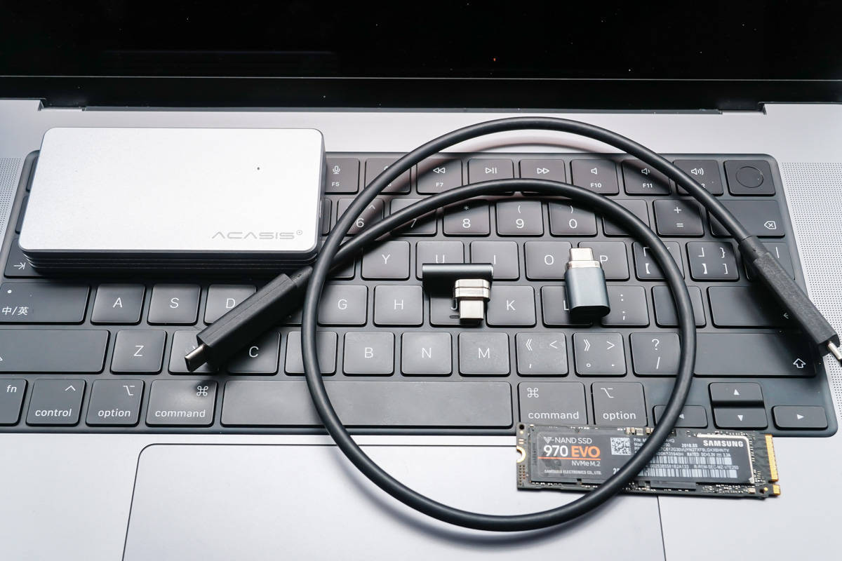 Tālāk apskatīsim datu pārraides testu. Izmantotie rīki ir Samsung 970 EVO cietvielu diskdzinis, Thunderbolt 3 cietā diska kaste, Thunderbolt 3 datu kabelis un divi adapteri.
