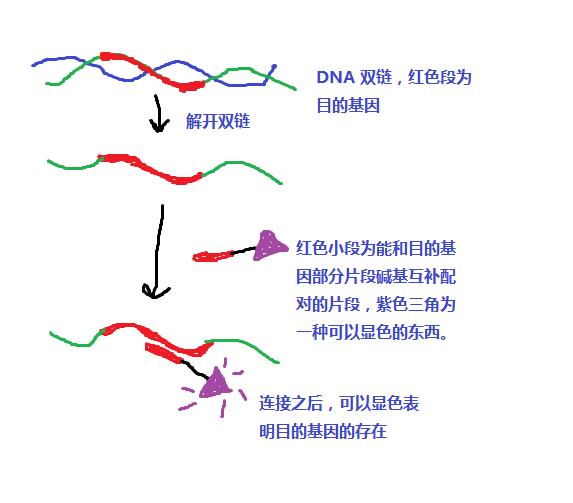 Pie atbilstoša pH, temperatūras un jonu stipruma DNS zonde var izveidot ūdeņraža saiti ar komplementāru nemarķēto vienpavedienu DNS vai RNS pārbaudāmajā paraugā, izmantojot molekulārās denaturācijas, renaturācijas un bāzes komplementārās savienošanas augsto precizitāti. apvienot, veidojot divpavedienu kompleksu.