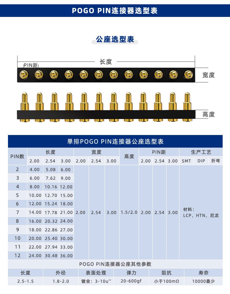 Mēs profesionāli projektējam, ražojam un pārdodam mobilo tālruņu pogo tapu uzlādes tapas, akumulatora tapas, antenas tapas un citus pogo tapas un savienotājus. Augstas strāvas uzlādes tapas Vīriešu un sieviešu savienotājiem ir maza izmēra, lielas strāvas, spēcīgu kontaktu un stabilas darbības īpašības.